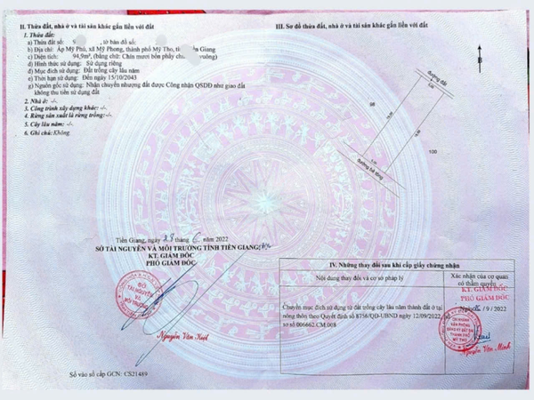 Chủ cần tiền gấp nên bán giảm giá nền 2 mặt tiền full thổ cư ở ấp Mỹ Phú xã Mỹ Phong thành phố Mỹ Tho.Tiền Giang.Tổng diện tích sử dụng 94,9m2 (5m x 19m) , mặt tiền chính hướng Đông Nam,mặt tiền phụ hướng Tây Bắc,khu dân cư đông đúc, đường trước đất rộng ít nhất 2 mét, chỉ cách đường tỉnh lộ 879B 100 mét..Cách trường Lê Văn Nghề 5 phút xe.., gần chợ Mỹ Phong, chợ Gò cát. Thuận tiện ra quốc lộ 50,ra quảng Trường, 10 phút xe vào trung tâm...Giá 550 triệu giảm còn 360 triệu triệu chủ bao giấy tờ (chủ chỉ bán giá này trong tuần, chạy tiền được về giá cũ)..Khách có nhu cầu vui lòng liên hệ em: Bạc : 0909883679 / 0964610354 hoặc tham khảo thêm thông tin nhà đất trên kênh Video : Bac Lang Thang..Em cảm ơn